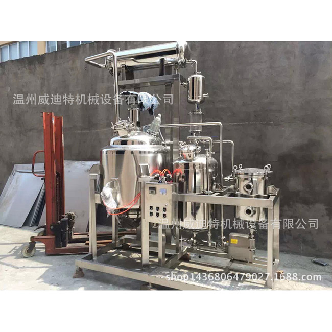 植物提取罐將準備好的處方藥放入提取罐,在一定時間內一次浸泡5-10倍(根據溶劑性質和工藝要求而定的藥品量),然后打開蒸汽閥加熱并常用的夾套加熱,在沸騰并提取一定時間后(僅在用水提取芳香油時才進行直接蒸汽加熱),從提取槽底部提取的熱提取物可以通過過濾器屏幕連續過濾到過濾器。輸入集中器。在濃縮過程中產生的蒸汽進入冷凝器,成為冷凝液,并作為新的溶劑噴入萃取罐。